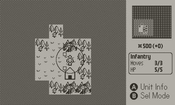 You move your units with the d-pad. When your unit is out of moves, you enter Selection Mode, where the d-pad instead moves focus between all the units on the map. Press Ⓐ to select a unit and move it around, or Ⓑ while a unit is selected to enter Selection Mode again. Pressing and holding the d-pad while in Selection Mode pans around the map and focuses any unit that comes into view. Pressing Ⓑ in Selection Mode ends your turn.